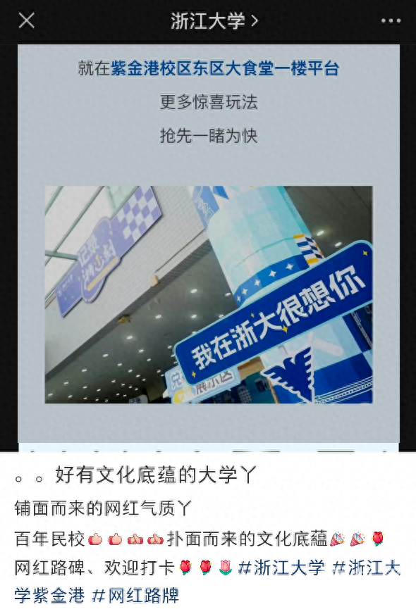 虽然浙大作为百年名校名声在外,好评如潮,但是本校生却一点也不给学校留脸面,有的同学直接拍照发到网上公开吐槽,说你真的太糊涂了,为什么要在学校里设置这种路牌呢?扑面而来的网红气息完全丧失了你的文化底蕴啊。作为浙大这样的高校,可以和清北等一众名校比肩,明明凭借着学校的实力和原本的风光,就能够让新生和家长们流连忘返了,真的完全没有必要弄一些网红打卡路牌。[color=rgba(0, 0, 0, 0.9)]