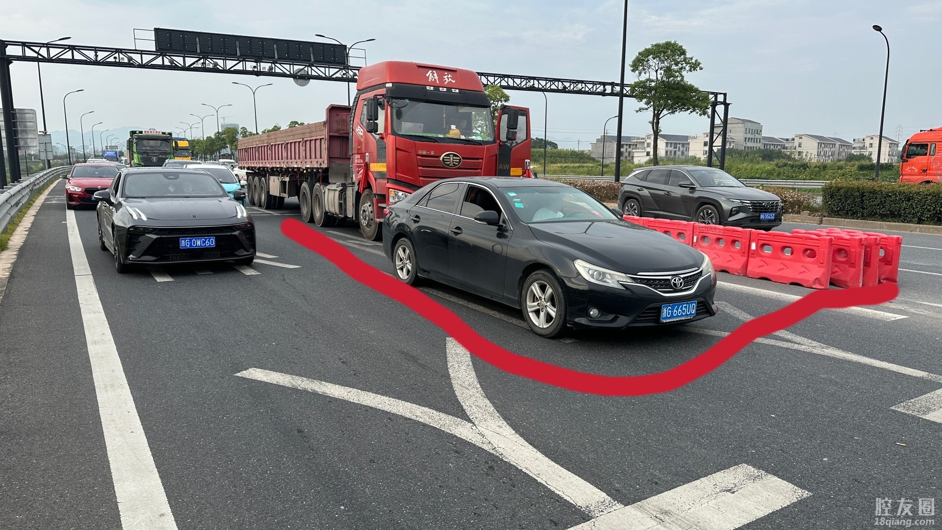 2023年9月13日上午7点45分途径疏港快速路东往西快到五州大道高铁高架路段,因拆除高铁护墩施工,原本五车道的快速路变成了二个车道通行,道路通行压力剧增,后方堵车。正值上班高峰期,为赶时间都在抢道通行,这时由于右侧小车未与大货车保持安全距离,造成小车左后保险杠与大车刮擦,占据了一个半车道。