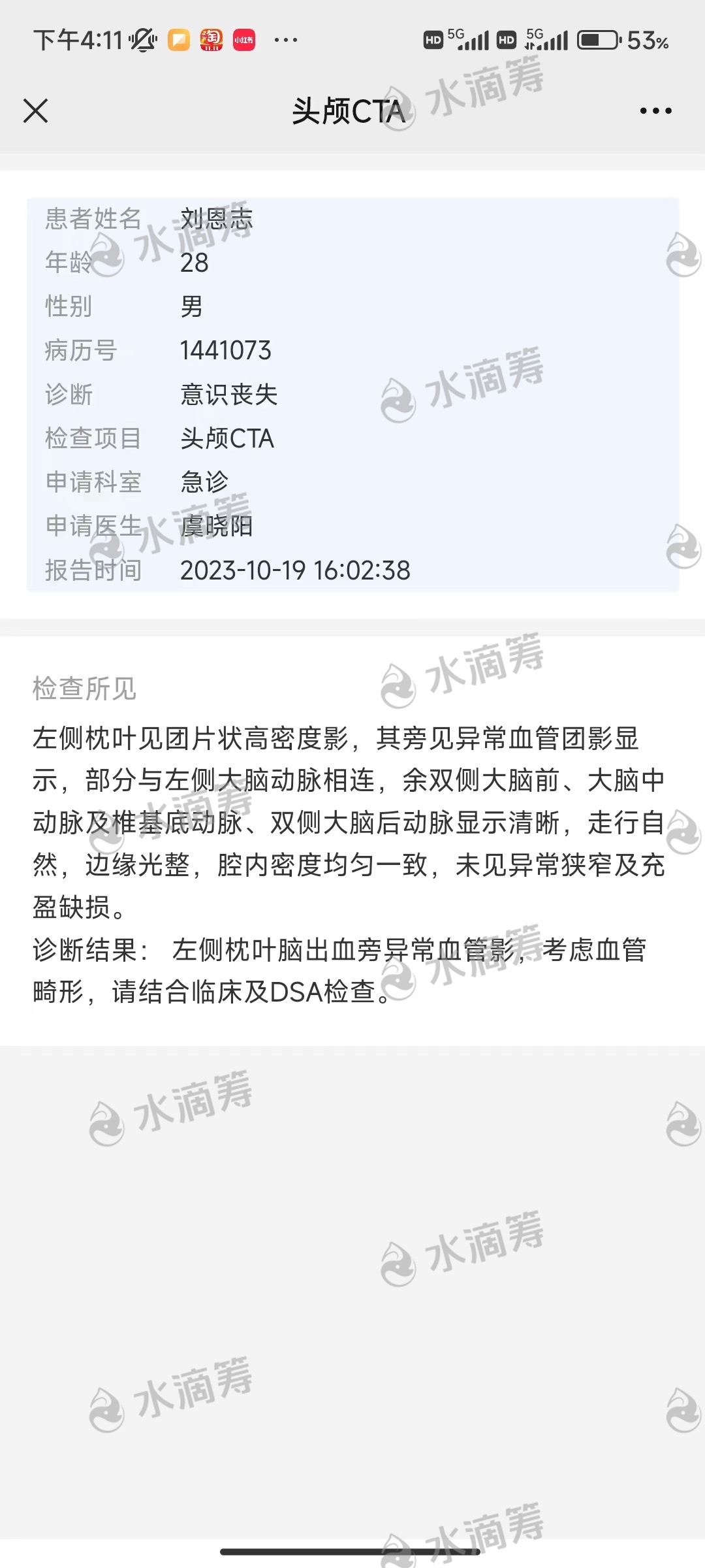 【老公在10月19号突然身体不适,出现头痛,当时急忙把老公送往浙江大学医学院附属第四医院进行了检查,当到医院的时候已经处于昏迷急忙推进了抢救室,结果诊断为脑出血,当天晚上直接做了长达4个小时的开颅手术,术后一直在重症监护室我们也见不到,现在还没有脱离危险,现在最重要的是先保命,如果后期再次出血的话还需要二次手术,等病情稳定以后要进行长期住院,康复,3-4个月后需要做脑壳修补手术】费用非常昂贵,当听到这个噩耗和这个天文数字的时候,一下子落到了万丈深渊,命运为何如此捉弄人?