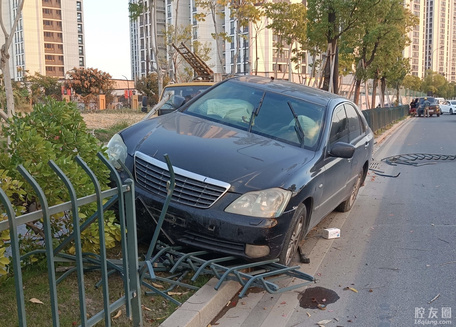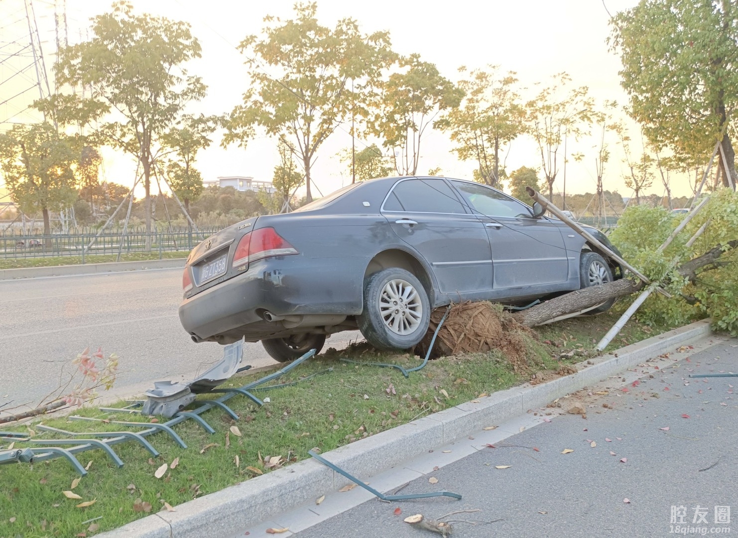 今天下午四点半左右,一辆丰田黑色轿车,在行驶过程中,不慎冲上右侧绿化带,撞毁隔离栅栏,撞倒樟树后停下。