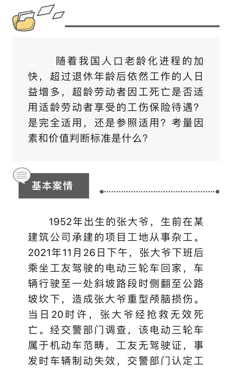 随着我国人口老龄化进程的加快,超过退休年龄后依然工作的人日益增多,超龄劳动者因工死亡是否适用适龄劳动者享受的工伤保险待遇?是完全适用,还是参照适用?考量因素和价值判断标准是什么?
