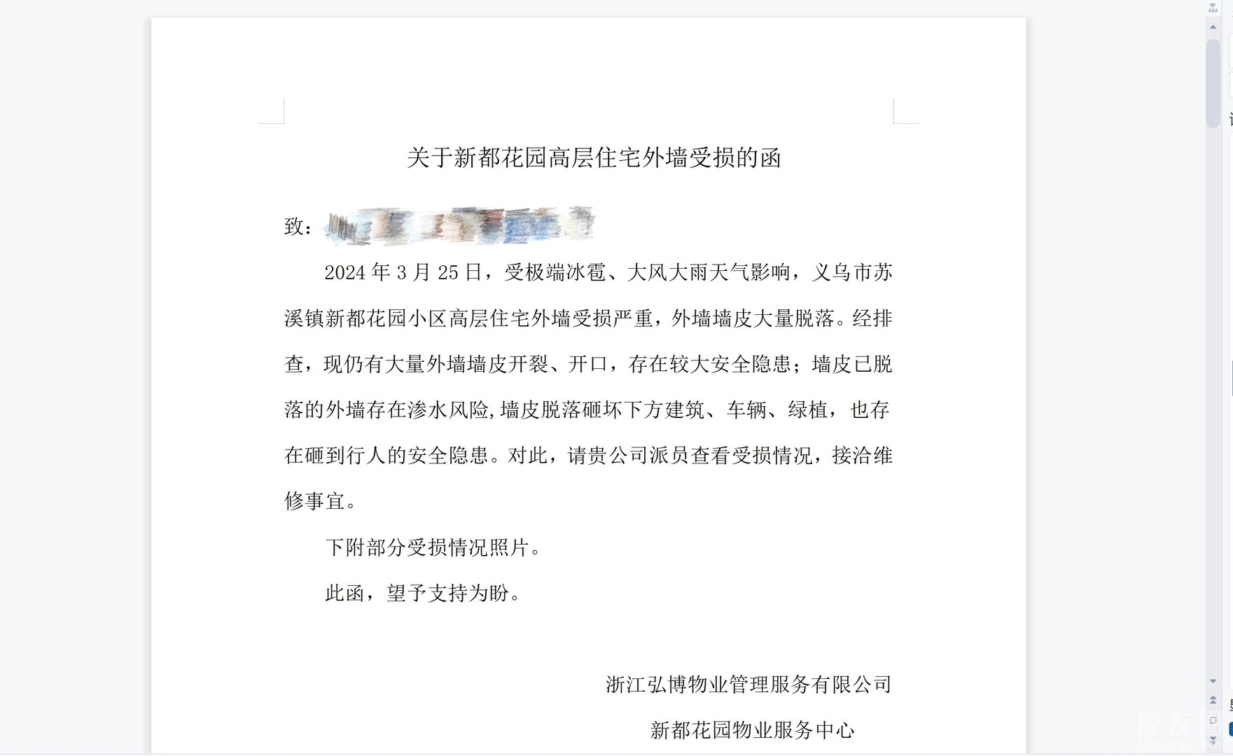 为此,记者找到了小区物业公司(弘博物业)了解情况。据物业公司相关负责人介绍,该物业公司在2022年正式入驻新都花园小区。“在我们公司管理期间,也曾多次发生墙体脱落事件,我们第一时间联系开发商进行维修,最近的一次维修在2023年10月份,虽然当时已经超过墙体保修期,开发商依然进行了修补工作。”