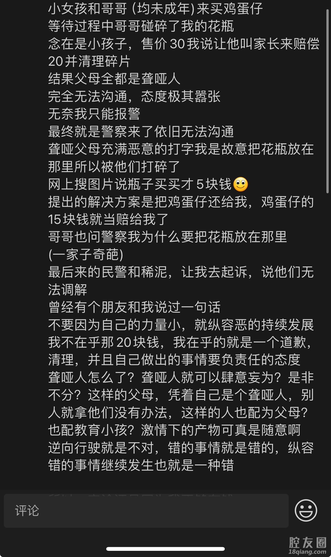 在我这里,这件事本已经过去了,我也没有打算发到网上来。结果昨天晚上,我朋友们在某音刷到了关于我店面及我本人照片的视频,是聋哑妇女发的,文案颠倒黑白,说我店东西不好,脾气大,说我看不起聋人。当时我就愤怒了。我自认倒霉,遇到了这样的一家四口,我已经吃亏,那就算了,对方居然还泼我脏水,诽谤我,想要力及聋哑人来网曝我,我无法忍受,忍无可忍,没有人愿意向这样的人低头。我可以不要赔偿,但是我不允许任何人泼我脏水。我可以忍气吞声,我可以不斤斤计较,我却无法忍受我已经选择了吃亏别人却还要颠倒黑白泼我脏水。如果每一个人面对这种弱势群体故意抹黑都选择沉默,只会助长他们继续作恶的信心。雪崩的时候没有一片雪花是无辜的。人生在世,人在做天在看,我行的正立得直,坦坦荡荡,不像这一对聋哑夫妇,带着小孩子,打碎了别人的东西不赔偿,甚至还洋洋得意的挑衅,利用自己聋哑人残疾人的身份肆意妄为,胡说八道,颠倒黑白,这样的教育方式,恕我不能苟同。这件事,我不会到此为止,这是我本人发血誓的澄清文章。我的所言句句属实,整条街道的人都可以为我作证!!!稠城街道昌德社区下门村一区28栋2号顶楼的龚昌浩一家,你们真的以为凭借自己是聋哑人身份就可以为所欲为吗?你们的老母亲,就可以倚老卖老道德绑架别人,说区区20块钱何必和聋哑人计较吗?别人的钱就是天上掉下来的,别人的钱就应该理所应当活该倒霉让给聋哑人的。你们的一对儿女,就可以被你们教育的是非不分吗?我是不会服的,我要你们给我赔偿花瓶费用且道歉!并且为了歪曲事实,诽谤他人,颠倒黑白而道歉!!!!