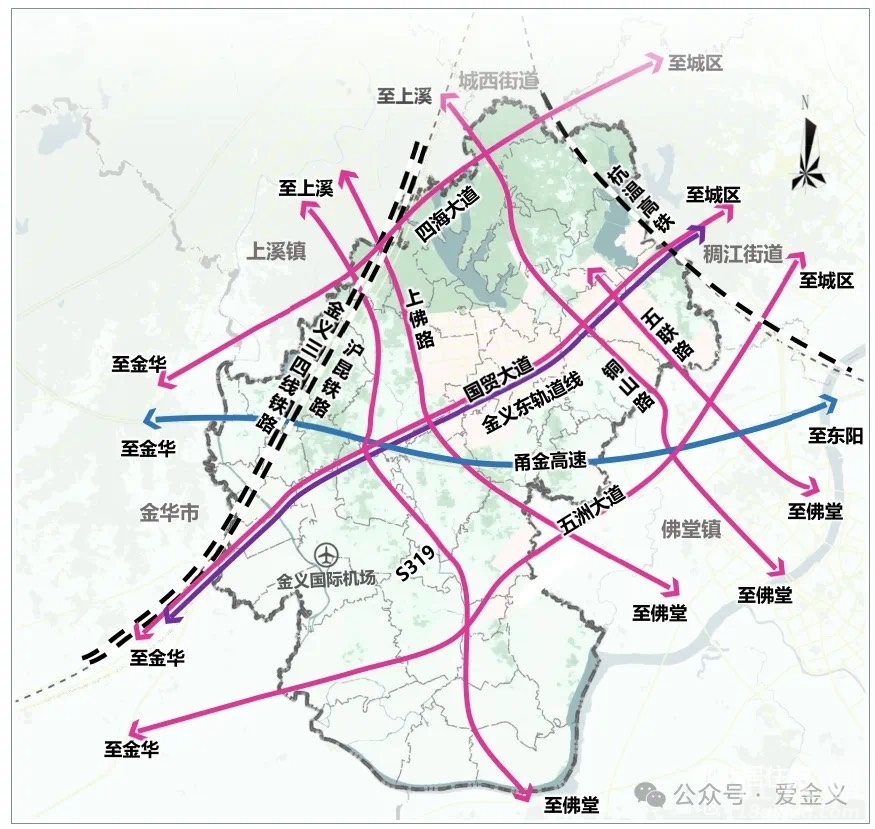 其中金义国际机场为国家重点项目,但目前仍属谋划阶段,预留机场建设空间,为未来发展进行控制。金义机场的建设也将提升义亭的城镇能级为区域综合交通枢纽城镇