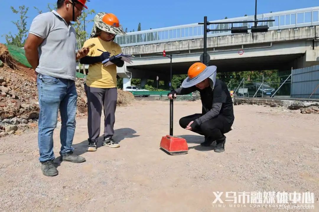 在项目现场,多台大型挖掘机有序作业,工人们紧张地进行施工。国贸大道苏溪出口辅道拓宽道路长约133米,宽8米。