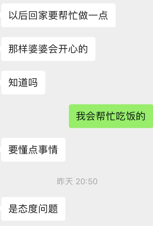 但是每次回婆婆家我妈就要叮嘱我,我娘家这边亲戚也会说我,让我在婆婆家帮忙