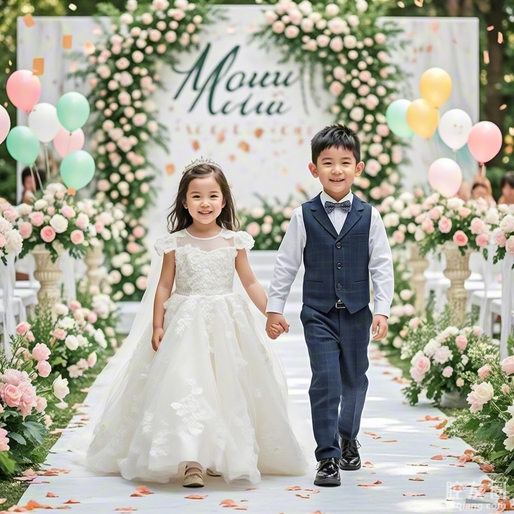 小女孩婚纱飘飘,皇冠闪闪,完全是缩小版的新娘