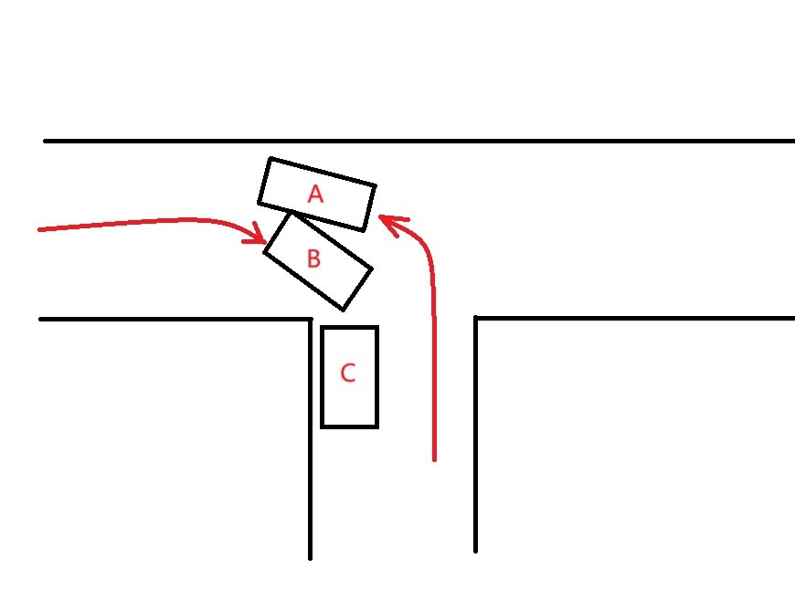 如图小区路口,A车左转,B车右转,C车停放路边。B车发现对面来车,路口狭窄无法通过,停车让行,等A车通过,但A车左转时未注意左侧刮碰到停止的B车。请问事故责任?