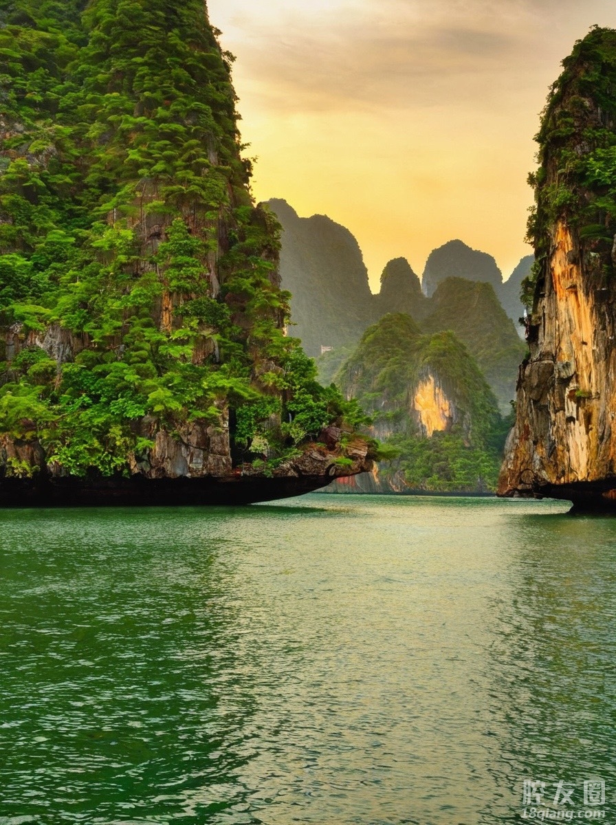 抬头看,那些山峰,简直就是大自然的杰作!巍峨耸立,绿意盎然,夕阳的余晖洒在上面,金光闪闪,让人忍不住心生敬畏!