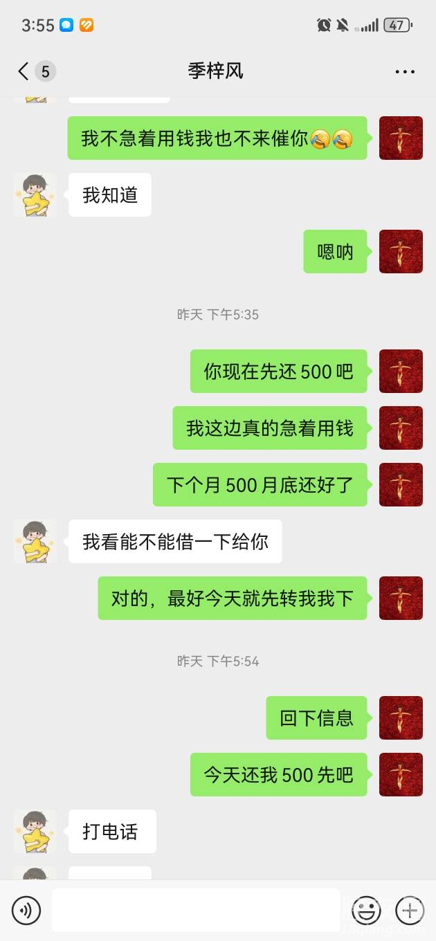 欠钱不还的人叫季梓风,只知道是义乌季宅的,具体家是几栋几号也不清楚,认识十几年的老同学了,说碰到困难找我借了4000说还贷款,说两个月之后就会还我,时间到了让他还钱说没有,我说那每个月。少还一点,这个月先还500,也说没有,微信语音打了五六个也不接,后面直接给我微信拉黑了,班级群里@他还直接退群了,还给我微信直接删了,为了这4000块钱,连脸都不要了。我也是佩服。